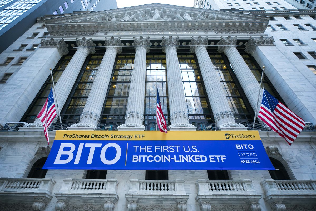10월 19일(현지시간) 미국 뉴욕증권거래소 건물에는 미국 최초 비트코인 관련 ETF인 BITO 거래 시작을 알리는 현수막이 걸렸습니다.