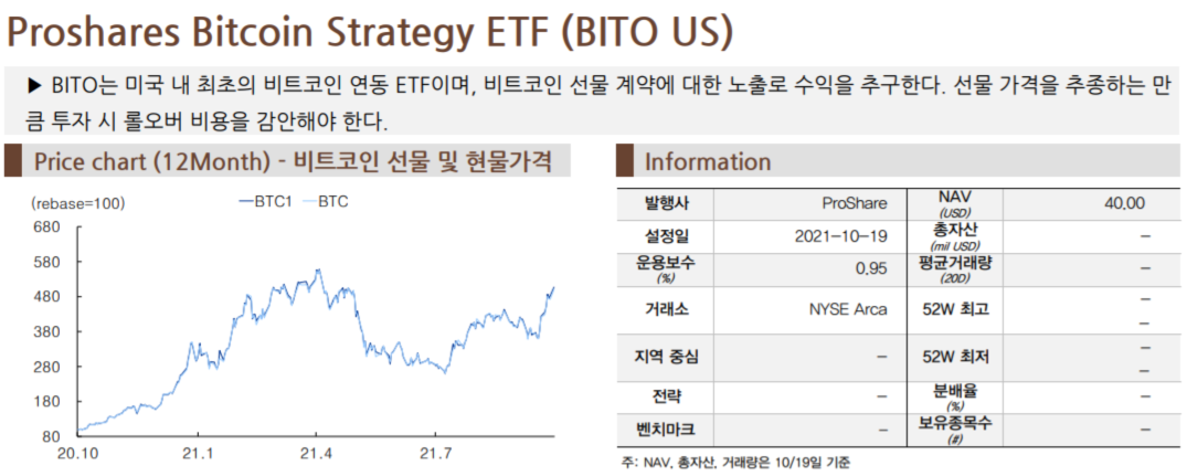 국내 투자자들은 BITO가 상장한 19일(현지시간)에 515만3830달러(60억7482만원)어치를 순매수(매수-매도)했고, 이날 페이스북, 애플 등에 이어 국내 투자자의 해외주식 순매수 상위 5위에 이름을 올렸다고 합니다.