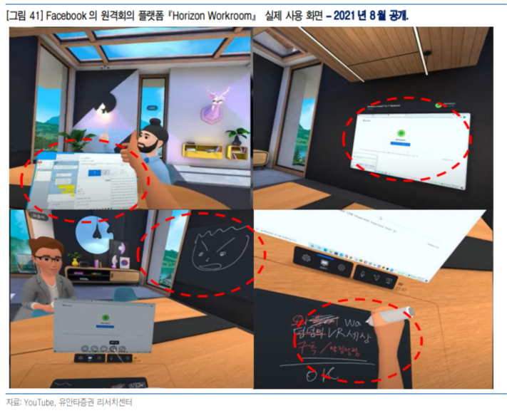 또한 가상공간에서 아바타를 만들어 이용자들끼리 어울리고 채팅하는 ‘페이스북 호라이즌’ 서비스를 시작했으며, 플랫폼 내 업무용 가상회의 앱 페이스북 호라이즌 워크룸(Workroom)을 런칭해 컨텐츠를 추가해나가고 있습니다.