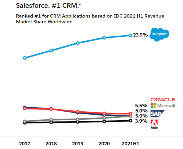 이렇게 CRM 분야의 획기적인 방법을 도입한 세일즈포스는 미국의 수많은 기업을 고객으로 만들며 빠르게 성장하여 SAP, 오라클, 마이크로소프트, 어도비 등과의 경쟁사 속에서 압도적인 시장 점유율 1위를 차지하고 있습니다.