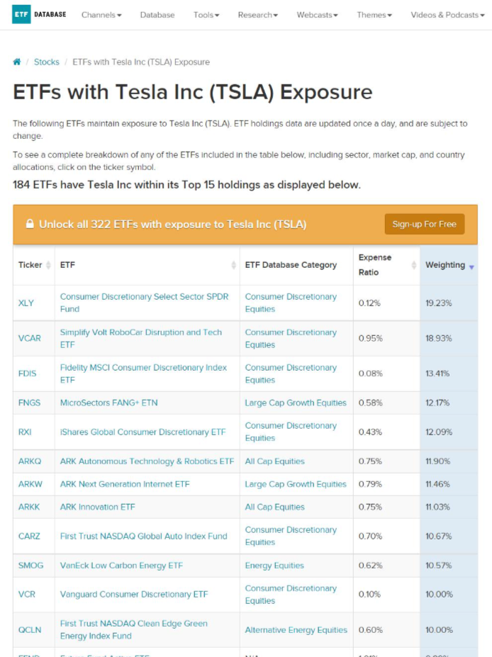 역시 ETF 정보 사이트로 유명한 etfdb.com 에서 특정 종목을 검색한 후 나오는 결과 중 'ETFs with 종목명 exposure' 글을 클릭해서 확인합니다.