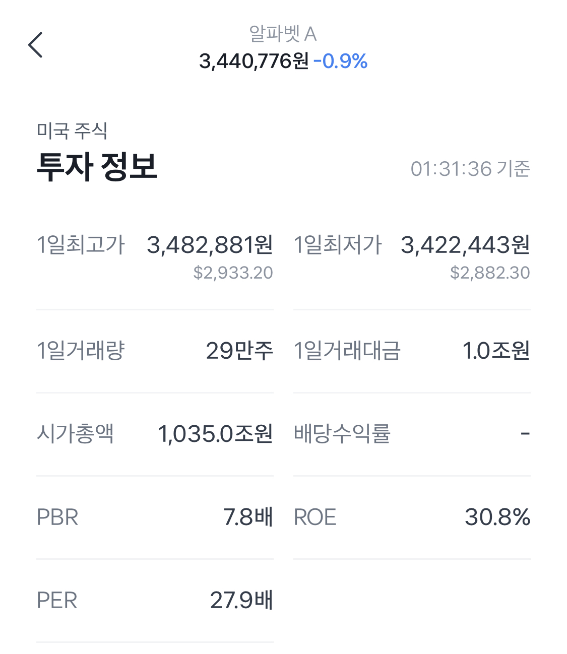 차트 밑에 '투자 정보'를 누르면 1일 거래량, 시총, PBR, ROE, PER를 보여준다.