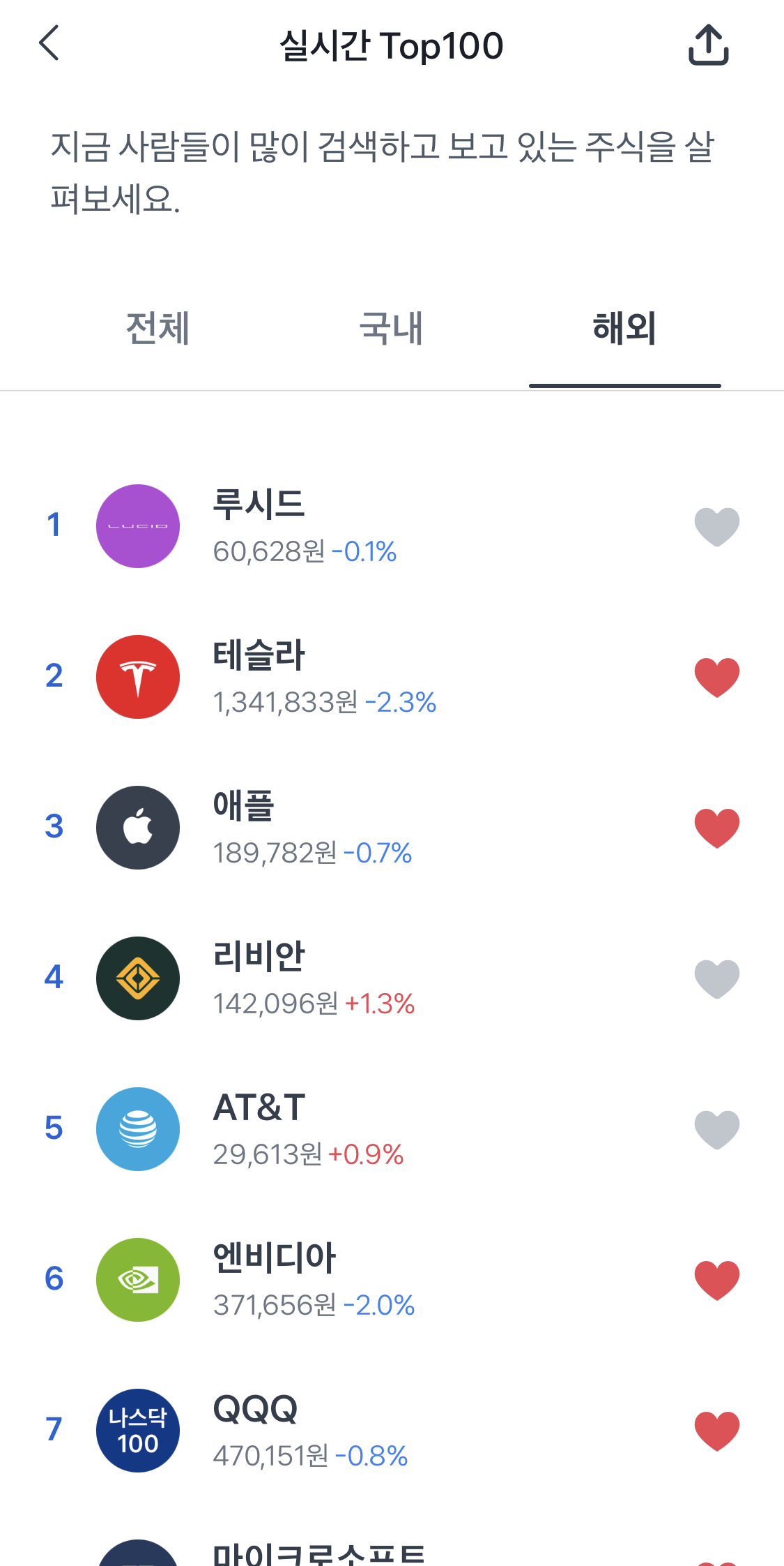 실시간 인기 종목들은 인기 메뉴에서 국내 / 해외로 보여준다