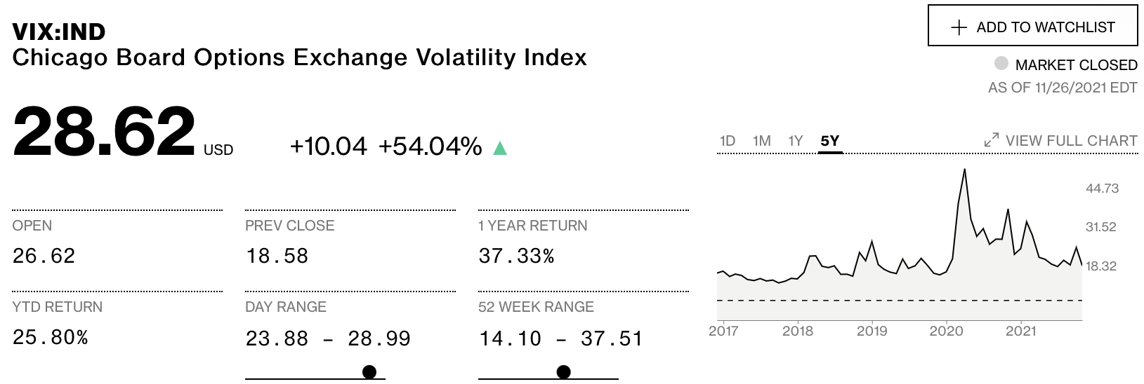 보통 변동성지수가 20 이하면 시장이 낮은 위험 아래에서 움직이는 것을 뜻하고, 20 이상은 공포가 차츰 증가하는 것을 의미합니다. 30 이상일 경우 고조된 변동성을 의미합니다.