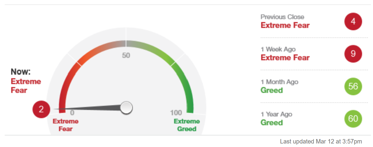 코로나19가 엄습한 시기인 2020년 3월 12일의 공포와 탐욕 지수(Fear & Greed Index) 입니다.