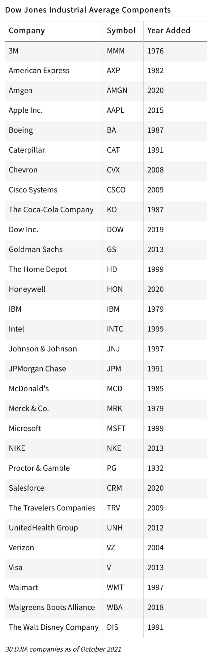 다우존스 산업평균지수 구성목록 (2021.10 현재)