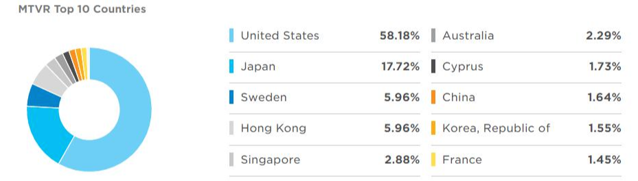 국가별로 보면 미국의 비중이 상대적으로 적고, 일본, 중국, 한국의 비중도 볼 수 있습니다.