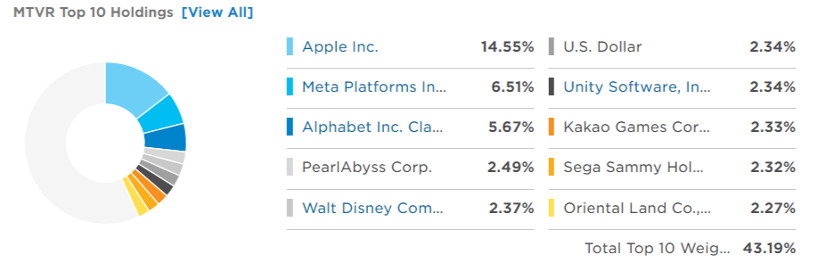MTVR ETF는 META 이후 약 4개월만인 10월 28일에 상장된 두 번째 메타버스 테마 ETF입니다. 메타버스를 증강현실, 라이프로깅, 거울세계, 가상세계로 분류하고 AI 알고리즘을 활용하여 메타버스 매출을 예측하고, 매출의 50% 이상이 메타버스와 관련될 것으로 예상되는 기업을 편입하는 방식입니다.